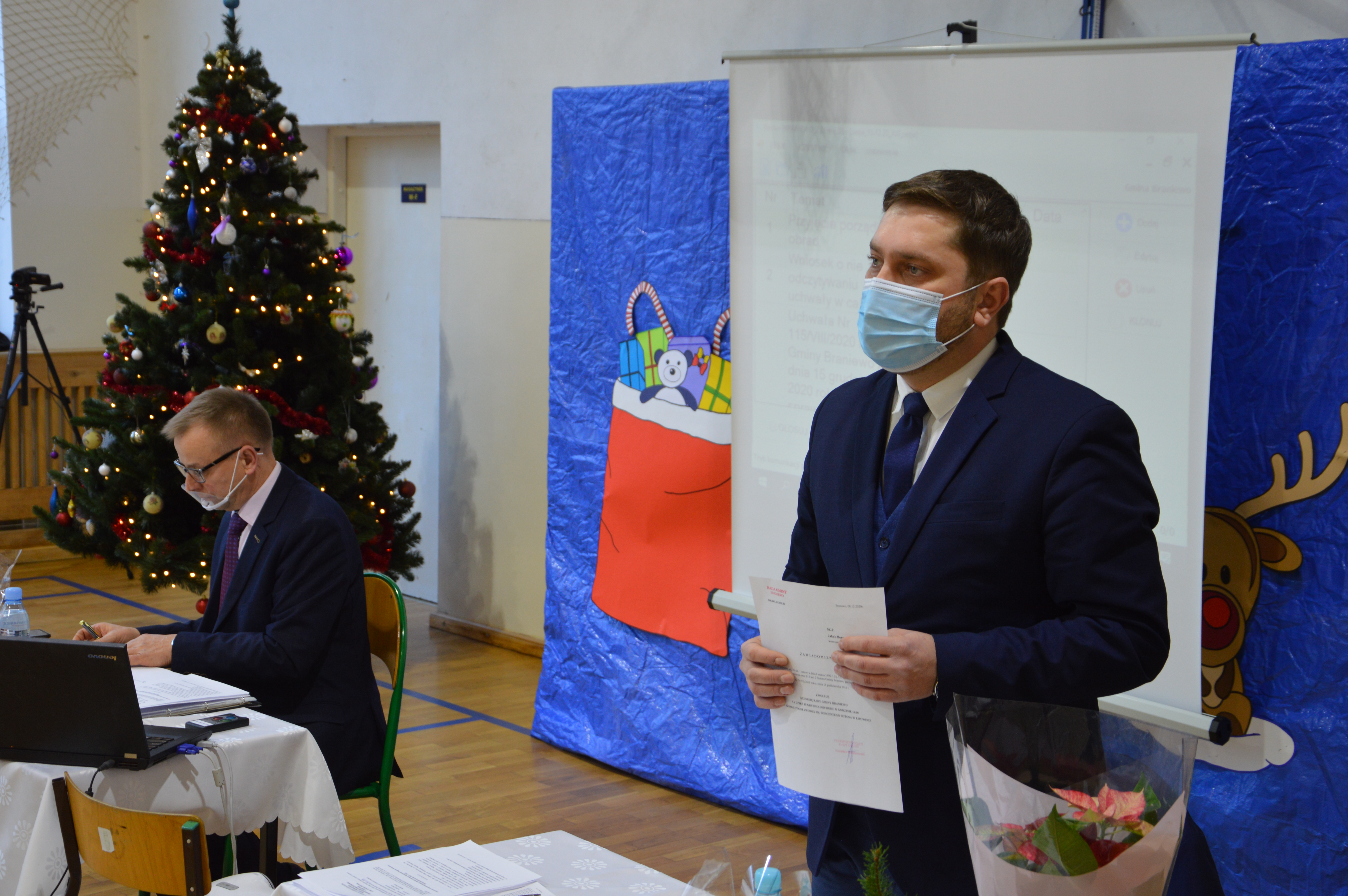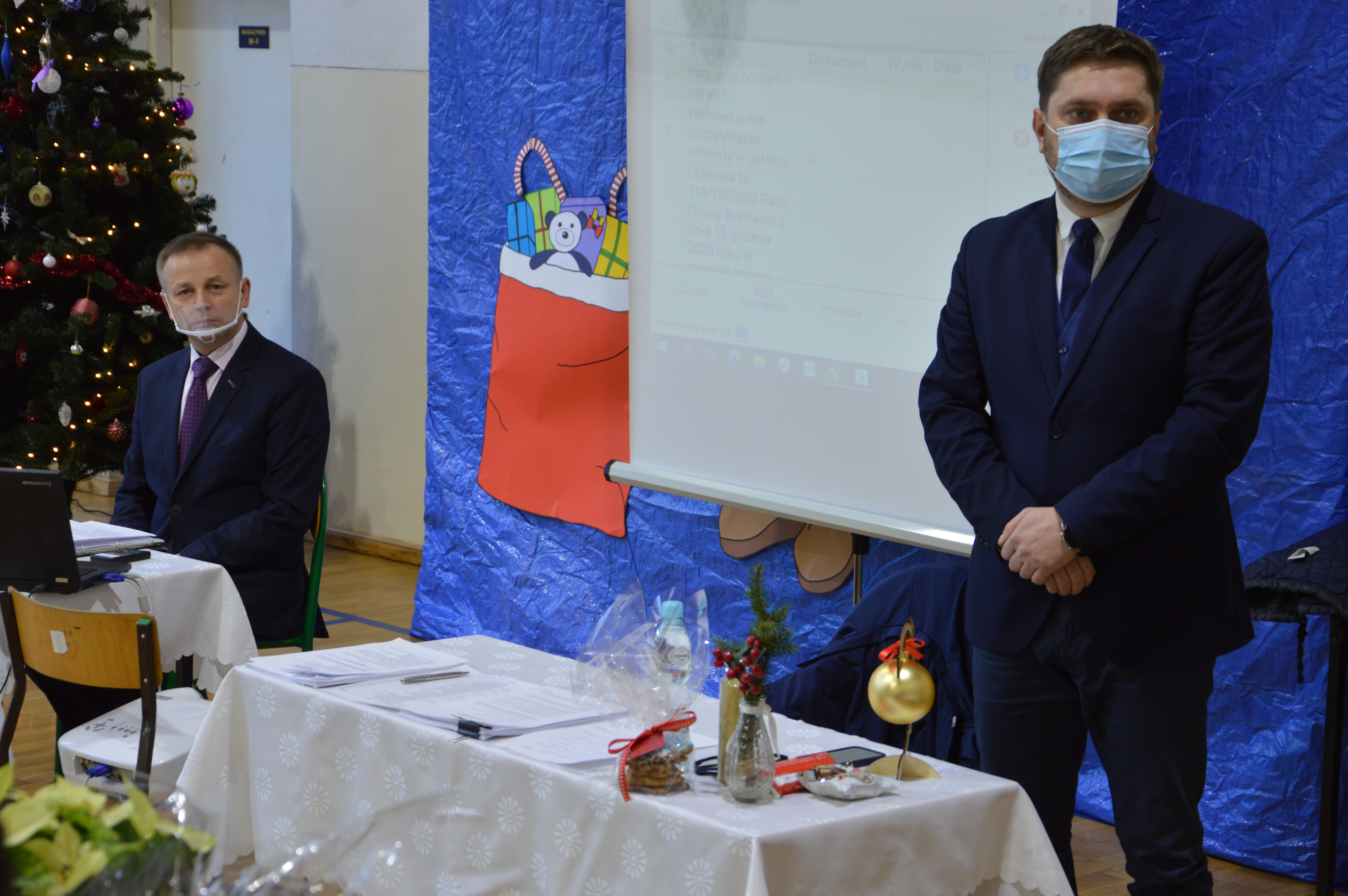 Oczywiście po wyjątkowej sesji Wójt Gminy Braniewo Jakub Bornus wraz z Przewodniczącym Rady Gminy Braniewo Panem Stanisławem Żołędziewskim złożyli serdecznie życzenia dla wszystkich zgromadzonych. Jednych z życzeń na Nowy Rok z pewnością jest to, abyśmy za rok mogli się spotkać już wszyscy - w pełnym składzie oraz w dobrym zdrowiu.